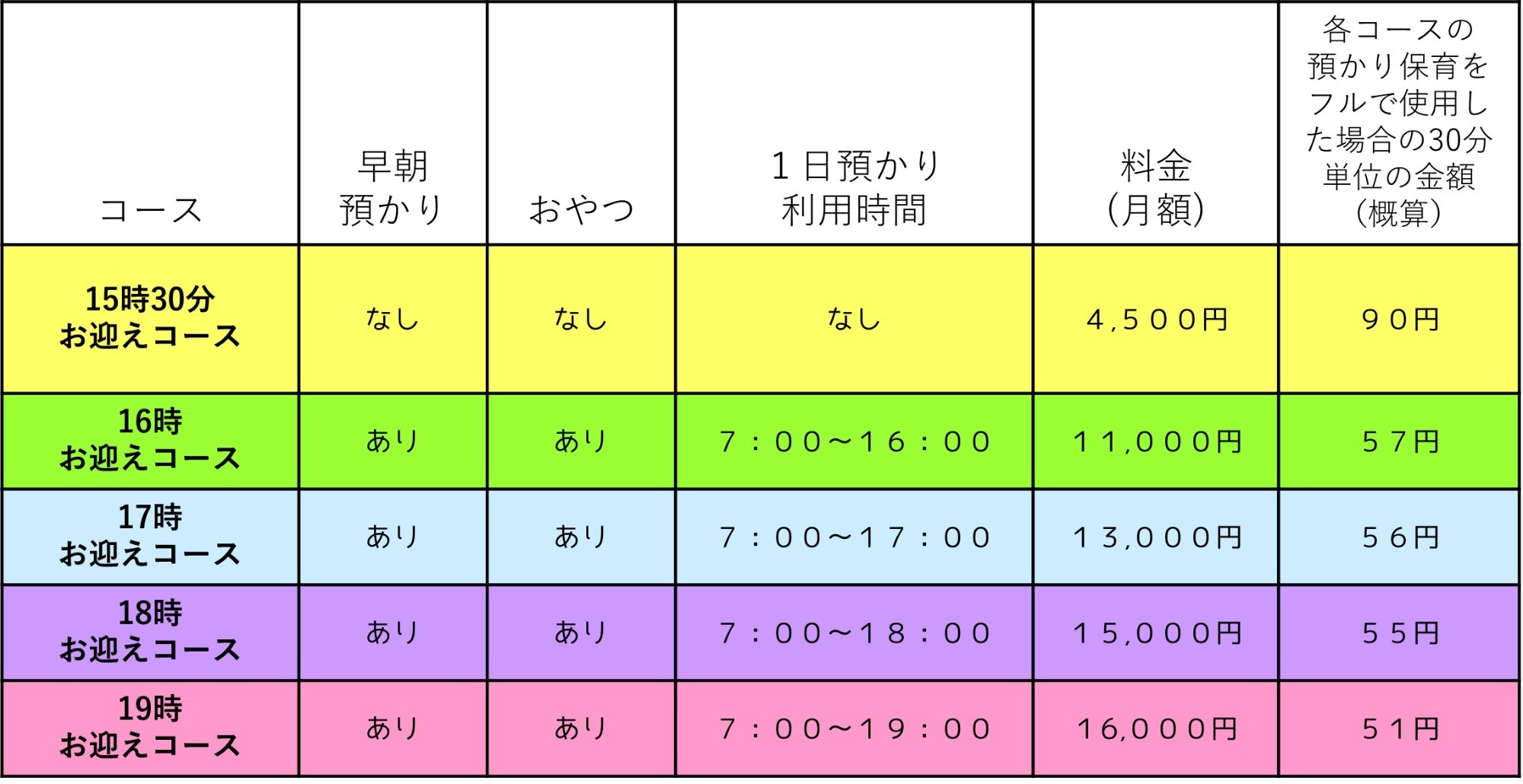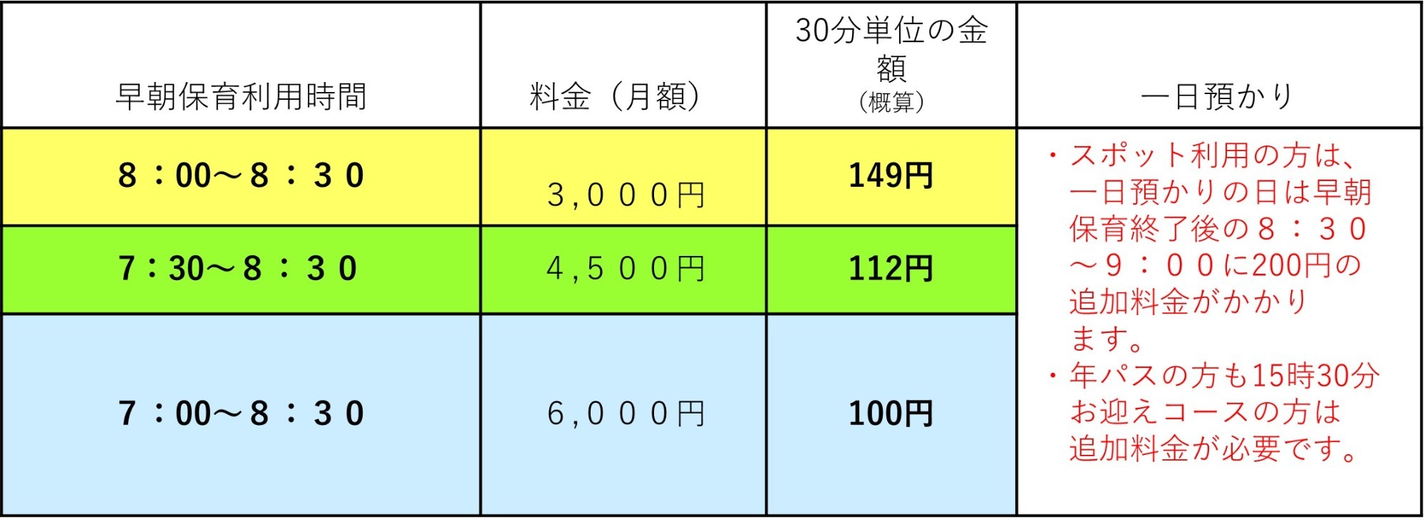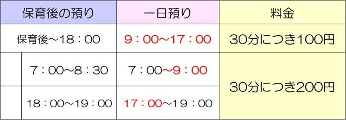 (※)早朝預かり・延長預かりは30分200円です。下表をご覧ください。