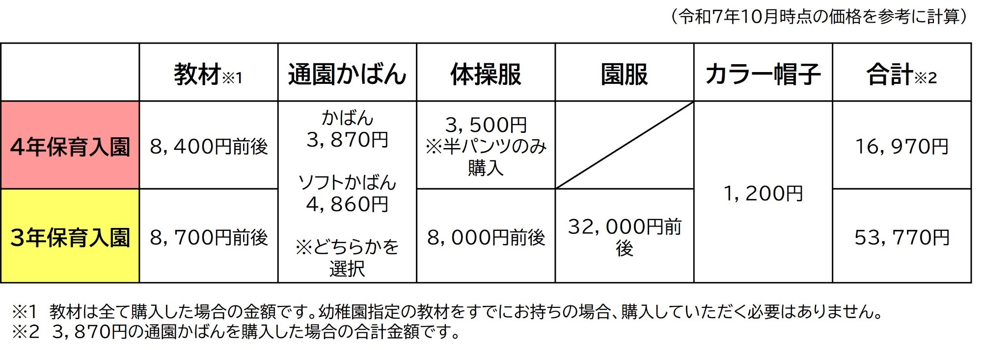 ◆入園手続き時に納入していただく費用(令和7年度参考)